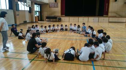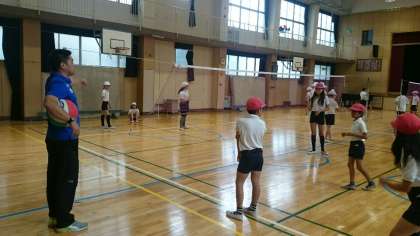 この日は、プールの代わりに、5・6年生は「ソフトバレーボール」を楽しんでいました。1・2年生は、体育ではありませんが、キャンプファイヤーのようなリクレーションをしていました。