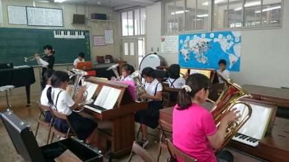 放課後、金管バンドの子どもたちが音楽室に集まり練習が始まります。金管バンドは、このようにして4月からだいたい週2〜3回の練習を積み上げてきています。