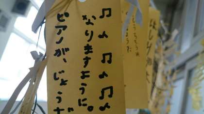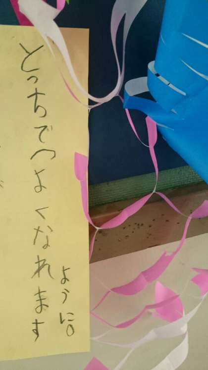 低学年の教室には、図工に時間につくった七夕の飾り付けに、それぞれ子どもたちの願い事が書かれた短冊がぶら下がっている。