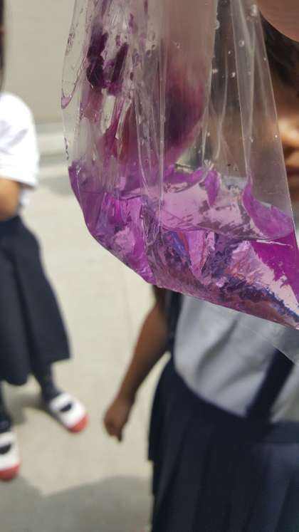 ビニルに水を入れて、もんでいると、だんだんきれいな色がでてきます。