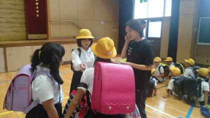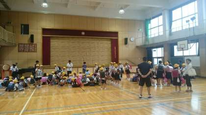 ・講堂で、地区別に並び替えて点呼をとる。(写真はここの場面です)