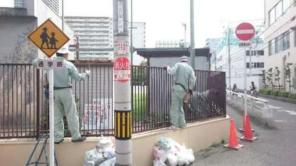 今回の営繕作業は、敷津小学校のまわりの柵のペンキの塗り直しだ。まる5日間かけて、今日の午前に作業が終了した。