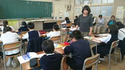 6年生の教室に、市内からたくさんの先生たちが集まって、研究授業が行われた。
