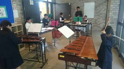 これは、講堂の入口付近で、低学年の木琴パートと鉄琴パートの子たちがパート別に練習している写真です。