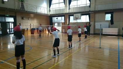 本日、2時間目に大阪教育大学の宍戸先生が来校され、英語を使って子どもたちにバレーボールの授業をしてくださいました。子どもたちは、英語を使っての指導に悪戦苦闘していましたが、先生方の丁寧な言葉がけとゼスチャーを交えての指導で次第に「何を伝えようとしているのか」聞きとろうとする態度がとれるようになってきました。授業時間の半分が経ったころには、英語の指示をすんなりと受け入れる子どもたちが何人もいました。子どもたちの順応するスピードの速さに驚かされました。
