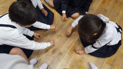 みんなで、こまきょうそうをしたり、さかさまでまわしたりして、あそびました。