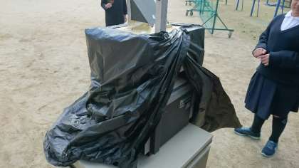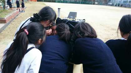 運動場に、昭和懐かしのOHP(オーバーヘッドプロジェクター)に黒いビニル袋で暗幕を作った装置が置いてあり、5年生の子どもたちが覗き込んでいる。