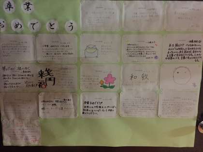 講堂の入口には、教職員から6年生へのあたたかいメッセージが貼ってあります。