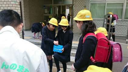 6年生たちが朝の校門に立ち、ユニセフ募金をしています。