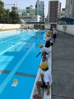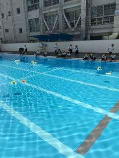 5時間目に、図画工作科の時間につくった「ぷかぷかゆらゆら」をプールに浮かばせました。教室で作っているときには、