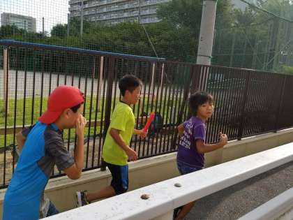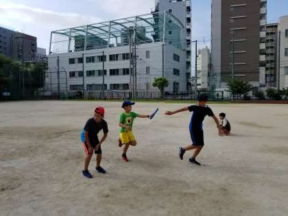 子ども会敷津ランナーズクラブの朝ランに加わり、プラスαでバトン練習もしています