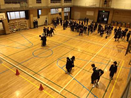 本日の児童集会では、縦割り班でボール運びリレーを行いました。