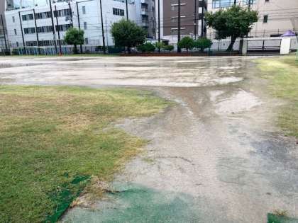 今朝、登校時間前に激しい雨がふりました。運動場に大きな川ができました。