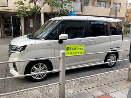 写真は青パトカーでまわってくださる方と校門前で見守ってくださる皆さん。
