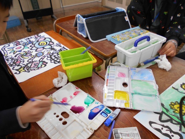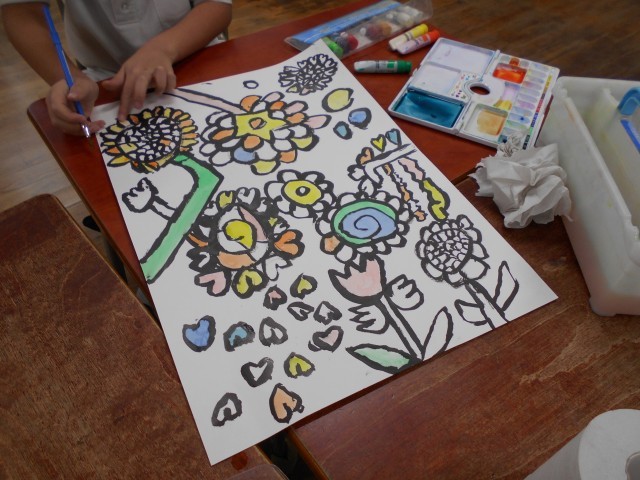 いよいよ絵の具で色をいれていきます。好きな色を選んで、そして混ぜて色をつくります。