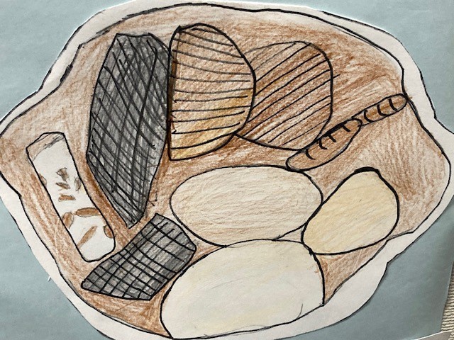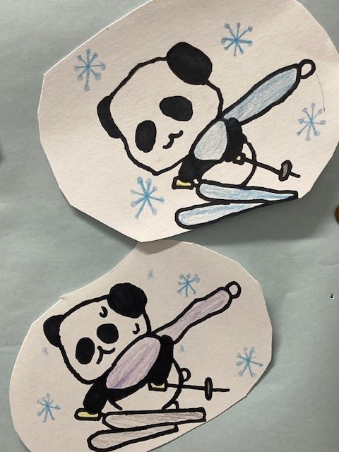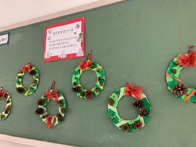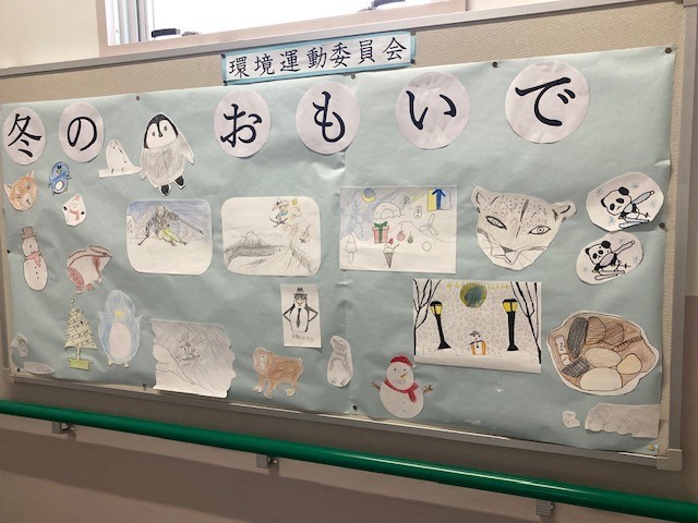 環境運動委員会作成の「冬のおもいで」が掲示してあります。おいしそうなものや楽しいスポーツが描かれています。1年教室前にはクリスマスのしつらえが。