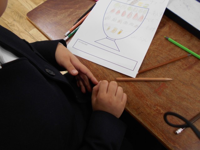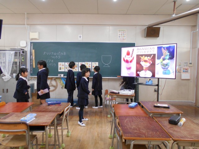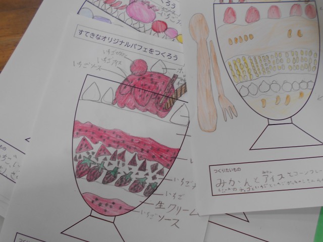 オリジナルパフェづくりをしています。自分があったらいいなと思うパフェを絵にかいてみます。クリームの層が五層もある甘いパフェや、イチゴづくしのパフェもあります。いよいよ来週から立体にしていきます。