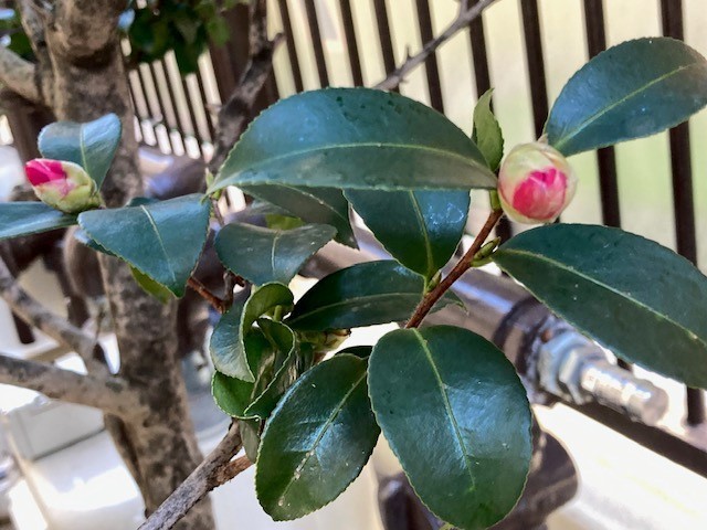 玄関わきの椿のつぼみ、ぐんぐんふくらんできました。