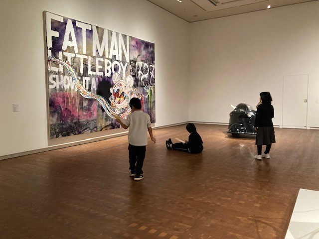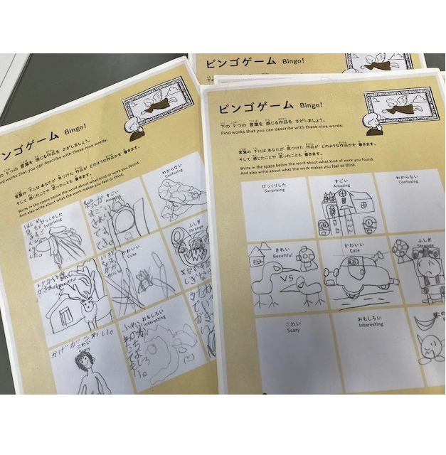 手に持っているワークシートは美術館のアクティビティ・ブックにある「ビンゴゲーム」です。自分が気になる作品や自分が「たのしい」「すごい」と感じた作品をメモします。たくさんの作品をみることができて「楽しかった」「また来たい!」と言いながら帰りました。国立国際美術館の皆様ありがとうございました。