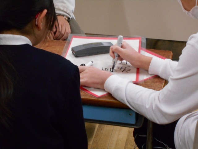 さてこの先生はだれでしょう?みんなで相談して、ホワイトシートに書いてカメラに示します。