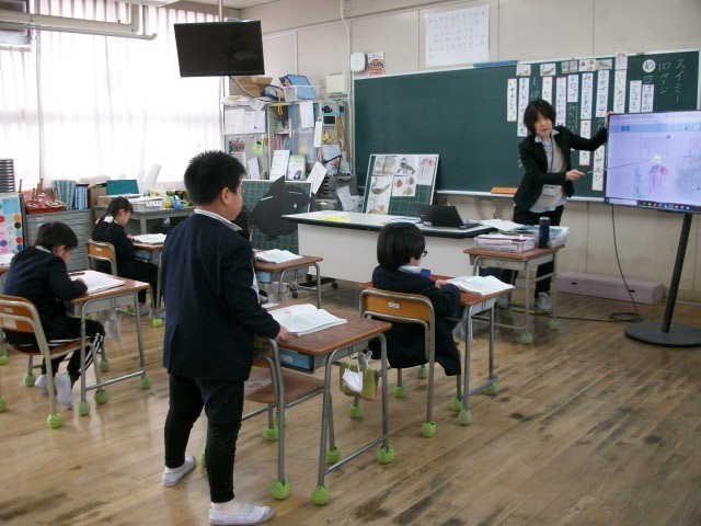 2時間目、総合教育センターの栗田先生にも参観いただきました。少し緊張した1年生でしたが元気に手をあげていました。