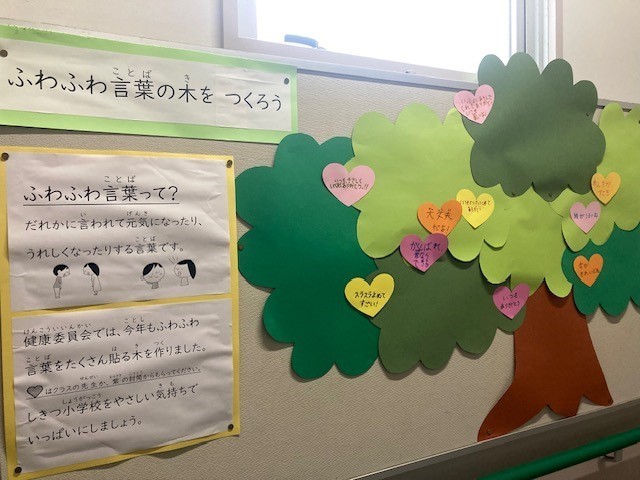 今年も健康委員会の「ふわふわことばの木」が始まりました。今年はどんな言葉があつまるかなあ。