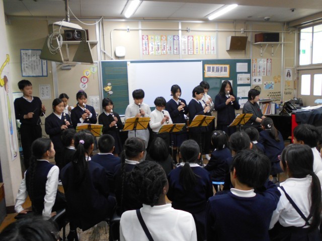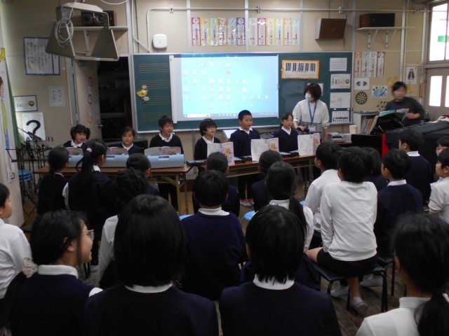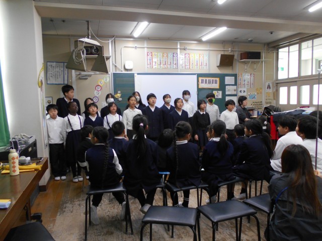 今日の5時間目は在校生全員でおこなう「合同音楽」でした。多くの先生がた、サポーターさんがみにきて音楽室は満員でした。学年ごとに鍵盤ハーモニカやリコーダー、歌の発表をおこない、途中の感想では「息継ぎがうまい」「音が重なってきれい」「そろっててきれいだった」など、みな他の学年の演奏の美しさにびっくりした様子でした。