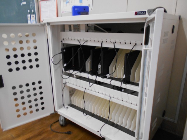 1枚目の写真は各教室の「学習者用端末」の保管庫です。ここにいれて充電します。