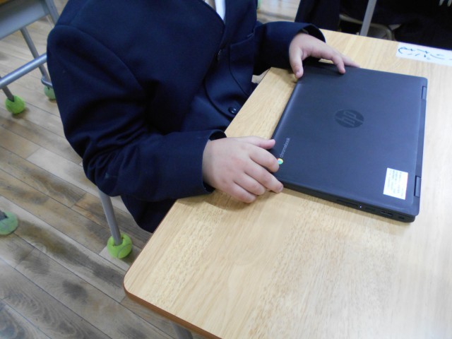 まず、端末の持ち方、気をつけること、パスワードは…などを2年生が伝えていました。