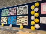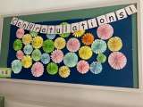 4年生作の美しい掲示物が卒業を祝います。講堂では卒業式の練習が厳かに行われていま...