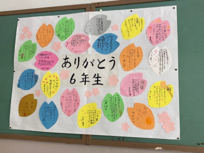 5年生作の「ありがとう6年生」。 2時間目に卒業式予行を4、5年生も参加して行い...