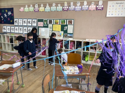 図画工作の造形遊び「ひもひもワールド」です。 教室が見たことない景色になっていま...