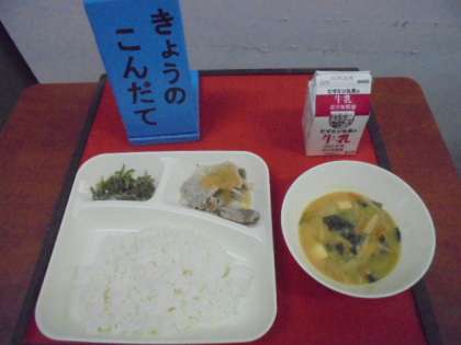 今日の献立は、豚肉のおろしじょうゆかけ、みそ汁、じゃこピーマン、ごはん、牛乳です。