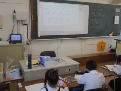 (中)線を引く練習。書画カメラを使って、わかりやすく教えています。