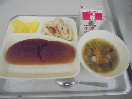 今日の献立は、マカロニグラタン、レタスのスープ、りんご(カット缶)、パン、牛乳です。
