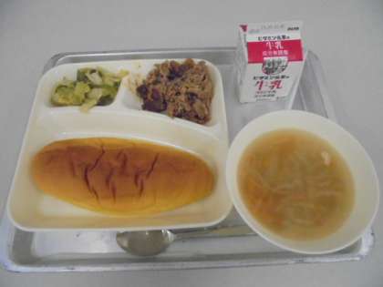 今日の献立は、豚肉のデミグラスソース、スープ、キャベツとピーマンのソテー、パン、牛乳です。