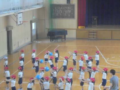 (上)体育館で、ボール送りゲームをしています。