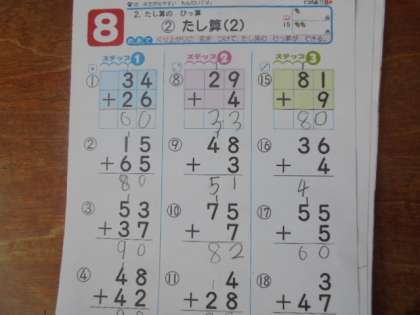 (上)計算ドリル「たし算のひっ算」を学習しています。
