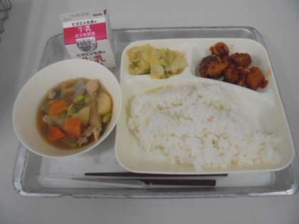 今日の献立は、まぐろのオーロラ煮、じゃがいもと野菜の含め煮、キャベツの梅風味、ごはん、牛乳です。