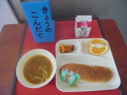 今日の献立は、カレースープスパゲッティ、焼きかぼちゃ、あまなつかん、りんごジャム、パン、牛乳です。
