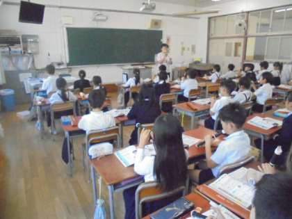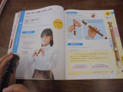 (上・中)3年生から初めて学習するリコーダーの練習です。担任の先生のわかりやすい合図に合わせて、みんながんばっています。