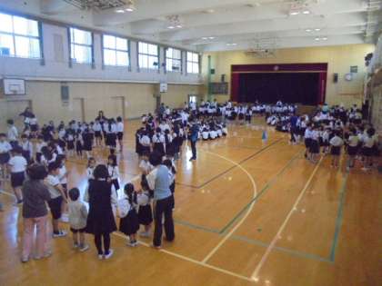 今朝の児童集会は、たてわり班で集まり、自己紹介をしました。