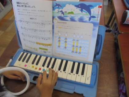 (下)鍵盤ハーモニカの練習をしています。