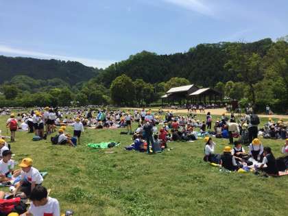 楽しみのお弁当。どのお弁当も愛情のこもったお弁当。青空の下たくさんの小学校と一緒においしくいただきました。
