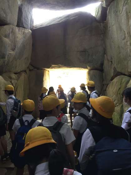 最後は、メインの石舞台古墳。古墳の大きさとひんやりした感触に「昔の人ってすごいな。」と改めて豪族の権力の大きさに驚いていました。