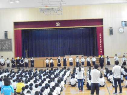 全校朝会で、前期児童会代表員の子どもたちが自己紹介をしました。