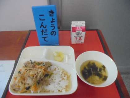 豚丼、湯葉のすまし汁、焼きじゃが、ごはん、牛乳です。