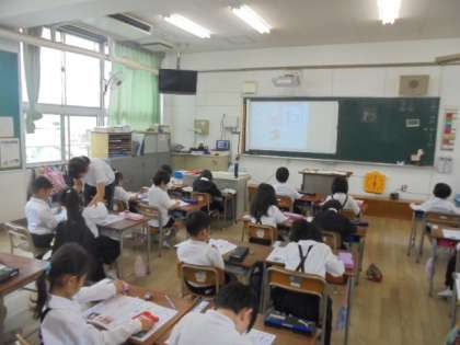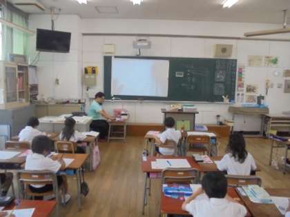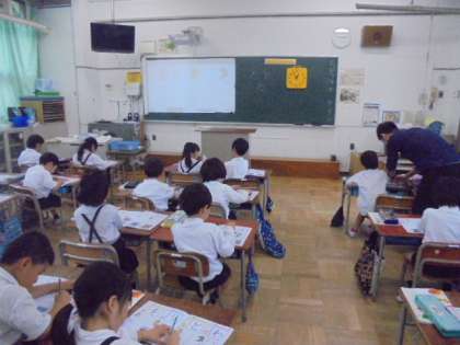 ひらがなの練習をしています。どの学級の子どもも、先生の手本を見ながら頑張っています。書画カメラを使った指導が、わかりやすいです。