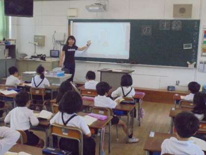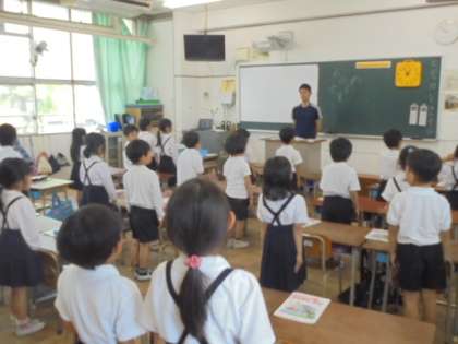 (下)授業が始まる前に、きちんとあいさつをしています。