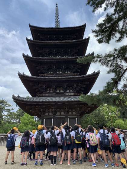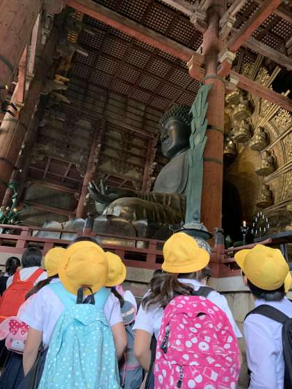 雨上がりの天気の中、5年生は遠足に行きました。学校から1時間、奈良公園に到着です。たくさんの鹿と戯れ、大仏、五重の塔も見学しました。
